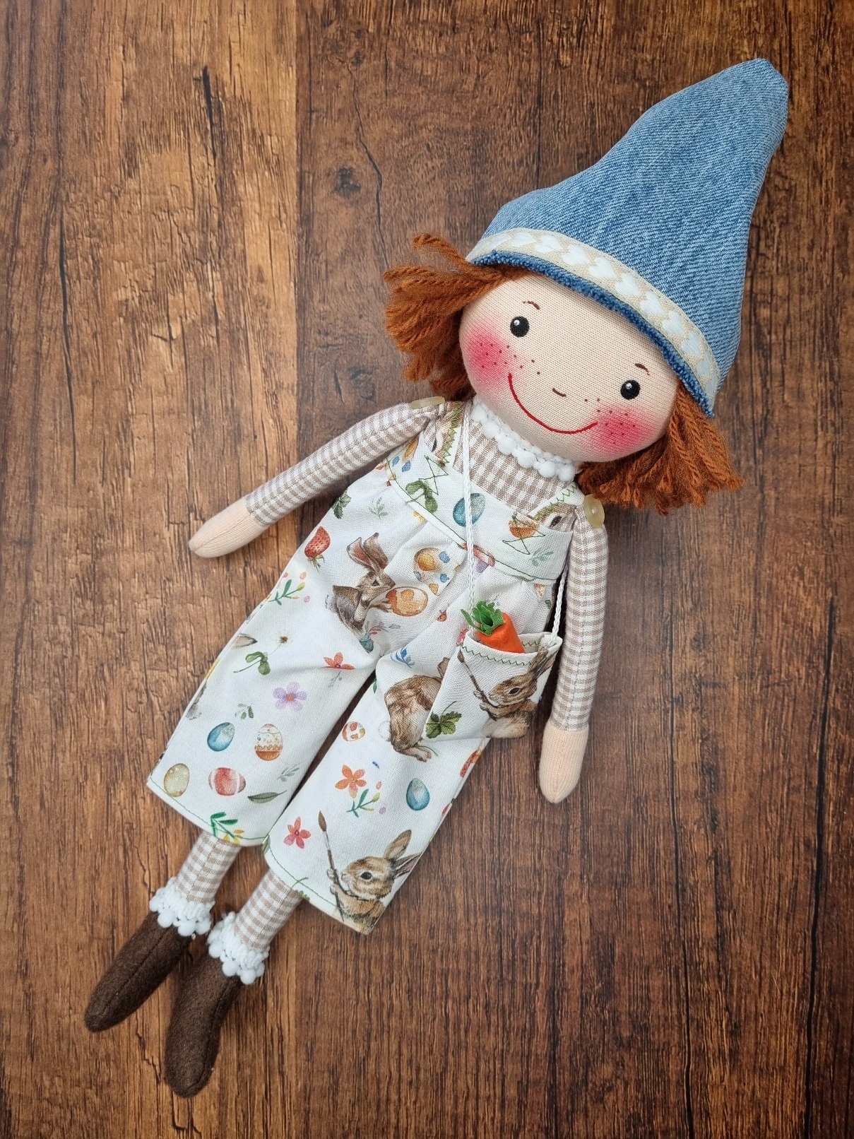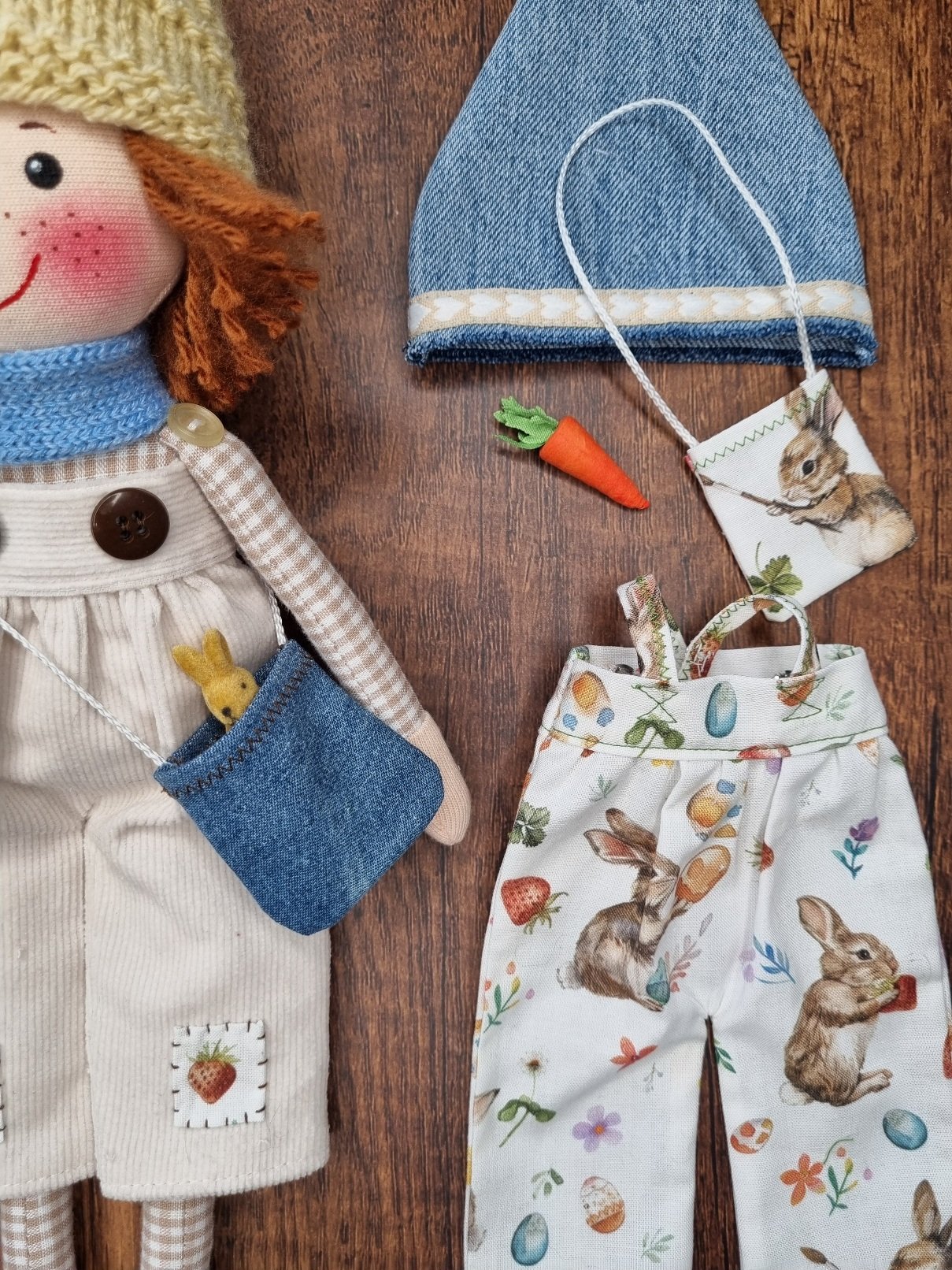 EDDIE hat ein Outfit für Ostern mit Häschenhose, Jeansmütze und einem Täschchen mit Karotte. Zum Wechseln gibt es eine Cordhose mit Strickschal und -mütze. In seiner Jeanstasche hat EDDIE den (Oster-)Hasen mit dabei!